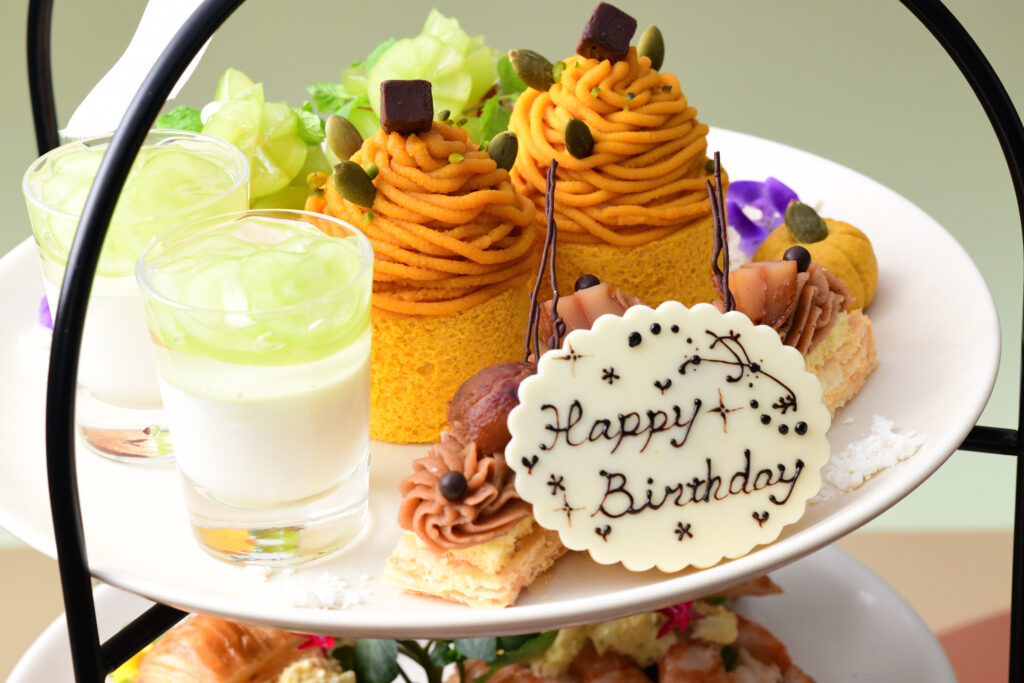 10月からは、ハロウィンをモチーフにしたデコレーションデザートがティースタンドを彩ります。愛らしい見た目と季節感あふれるスイーツは、写真映えも抜群。