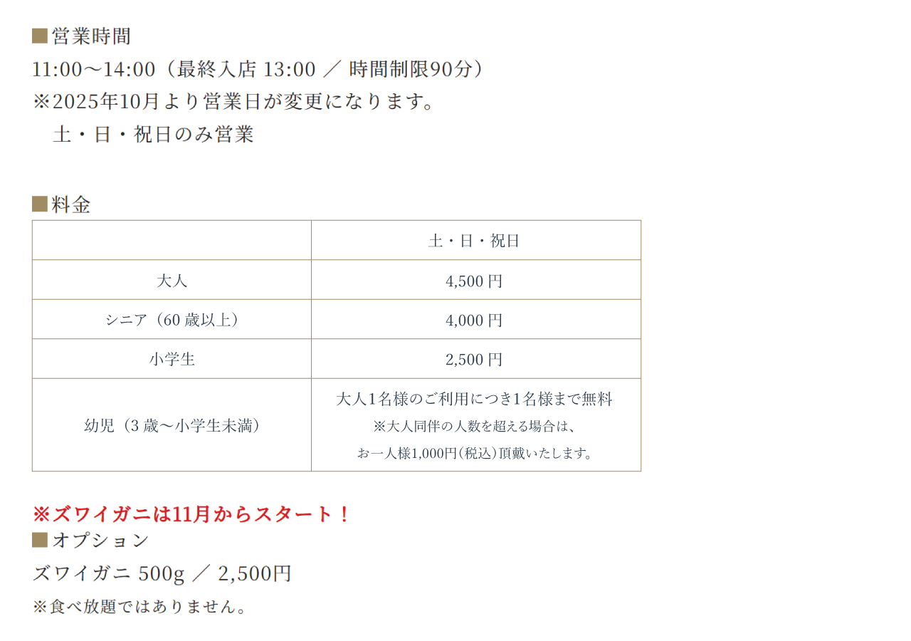 ― 2025年10月から営業日変更、11月よりズワイガニ食べ放題スタート ―