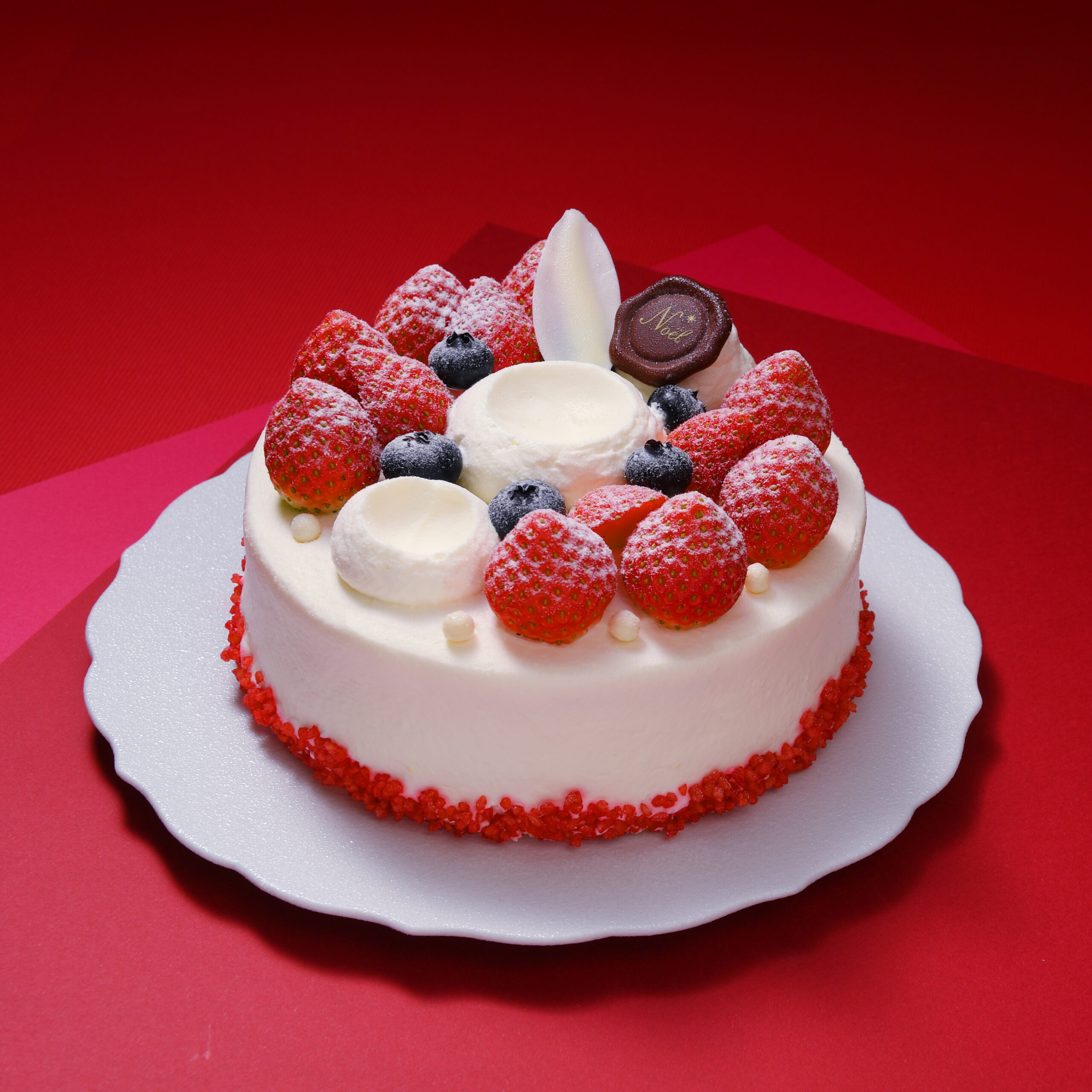 はちみつと素焚糖(すだきとう)を使ったスポンジに、まろやかな北海道産生クリームと、甘みと酸味のバランスがとれたいちごを合わせました。ブルーベリーとサクサク食感のアーモンドクラックランフランボワーズがアクセントに。
