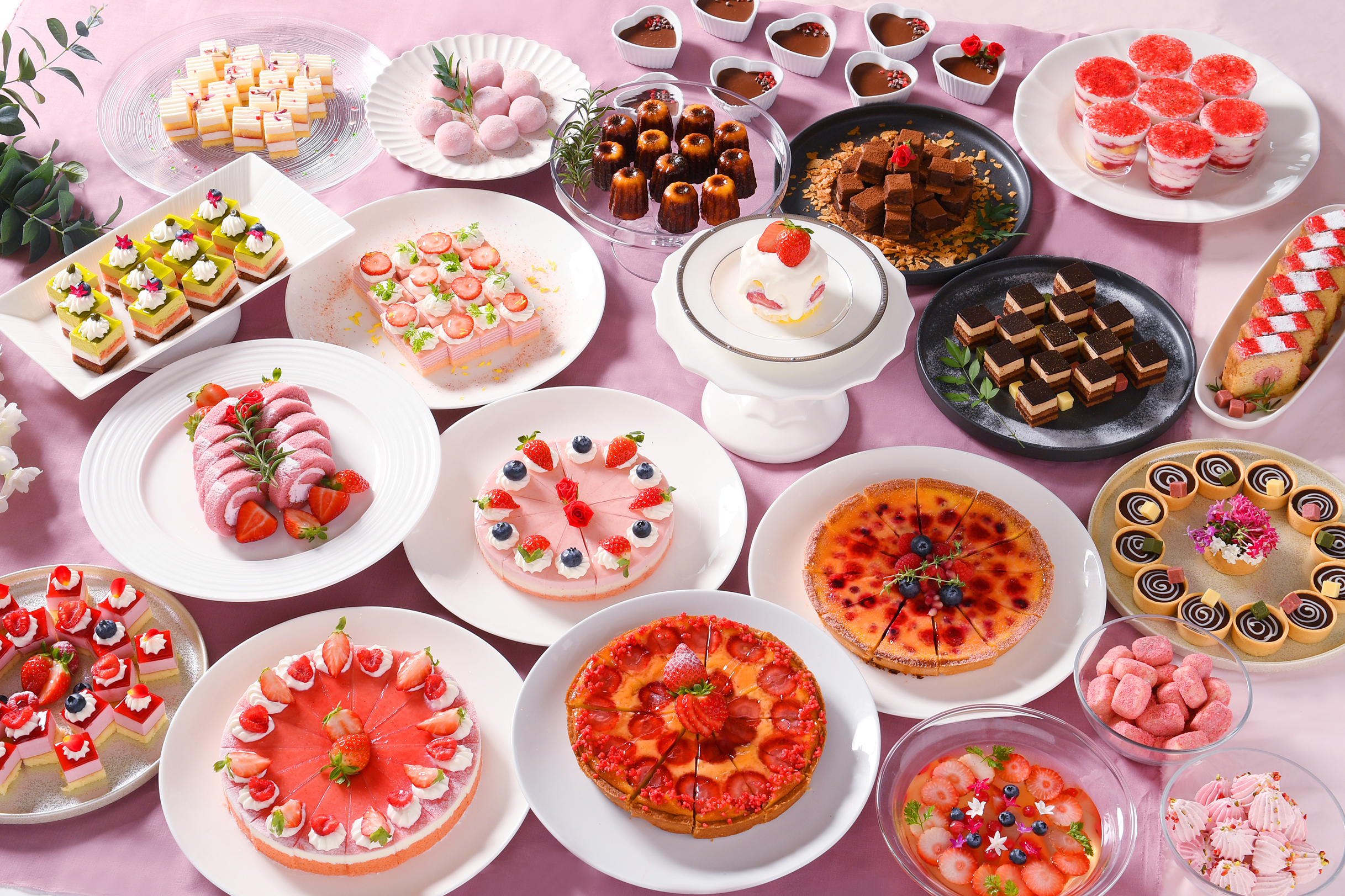 いちごミルクレープ、いちごティラミス、とちおとめムースなど、写真に撮りたくなる“いちご尽くし”のスイーツが勢ぞろい。