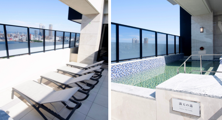 当施設はホテル「THE RISE 大阪ユニバーサルベイサイド」の最上階に位置しており、日帰り入浴はもちろん、宿泊とあわせた贅沢な滞在をお楽しみいただけます。